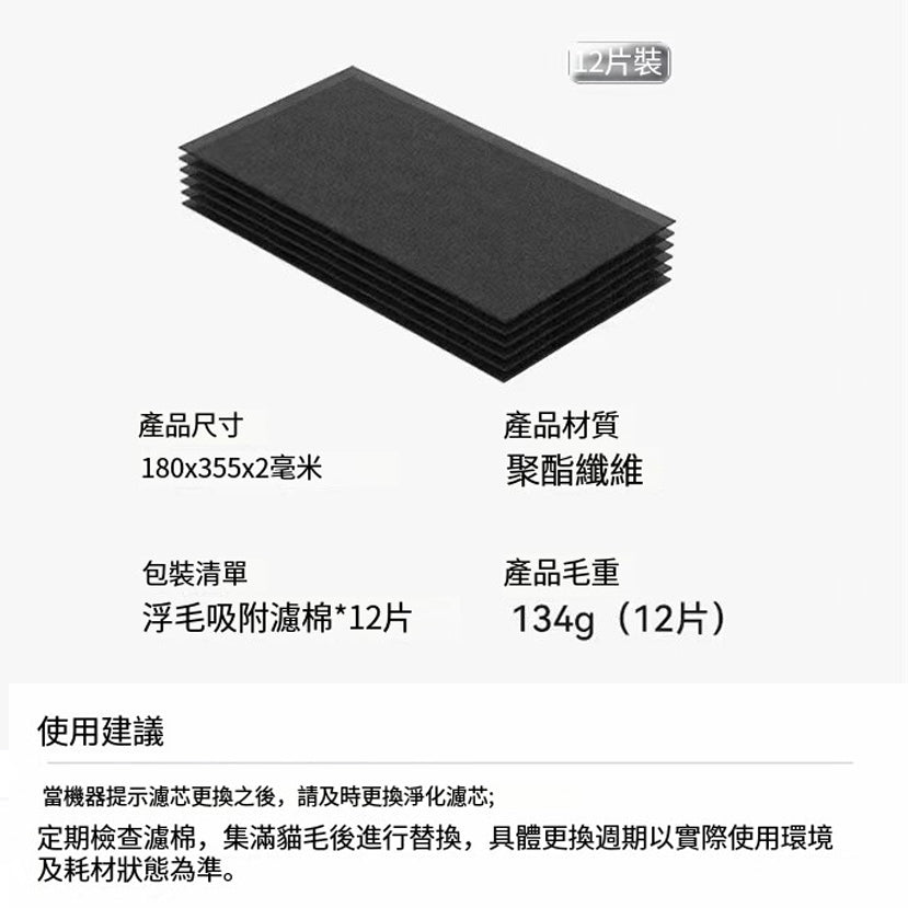 淨重:0.011kg尺寸:180*355*2浮毛吸附濾棉,高效快速聚毛。杜絕浮毛重新釋放到空中,造成二次污染。毛滿即換,一撕一貼,高校便捷。