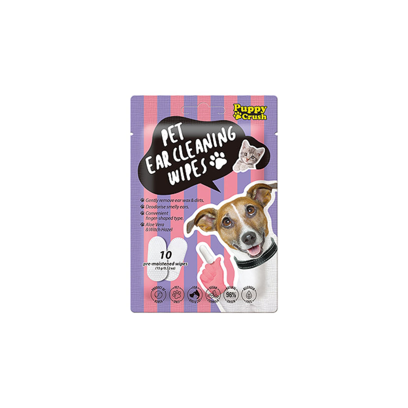 1. 打開罐子,用乾淨的手拿起指套濕巾。 2. 將濕巾滑動套到食指上。 3. 用手指輕輕擦拭耳朵部分,如有必要,重複使用清潔的指套濕巾,直到使用後沒有可見的碎屑。4. 每週使用1-2次,以保持耳朵的清潔